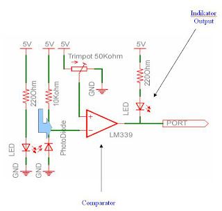 Voutput = PORT Berikut rumus Comparator: Voutput = (Vtrimpot - VphotoDioda)% 90.Vcc misalkan:Vtrimpot = 3 Volt VphotoDioda = 3 VoltVcc = 5 Volt Maka: . Voutput = (3-3)% 90,5 = (0) bahasa Dari 4 , 5 = 0V -% 90.vcc → untuk menentukan jarak di KTI keluaran tegangan Yang keluar Bahasa Dari komparator. Bila dilihat Bahasa Dari Contoh Diatas Maka jarak di KTI keluaran tegangan Yang keluar ANTARA 0-4,5. - 0V → tegangan output Yang keluar Bahasa Dari pembanding.
